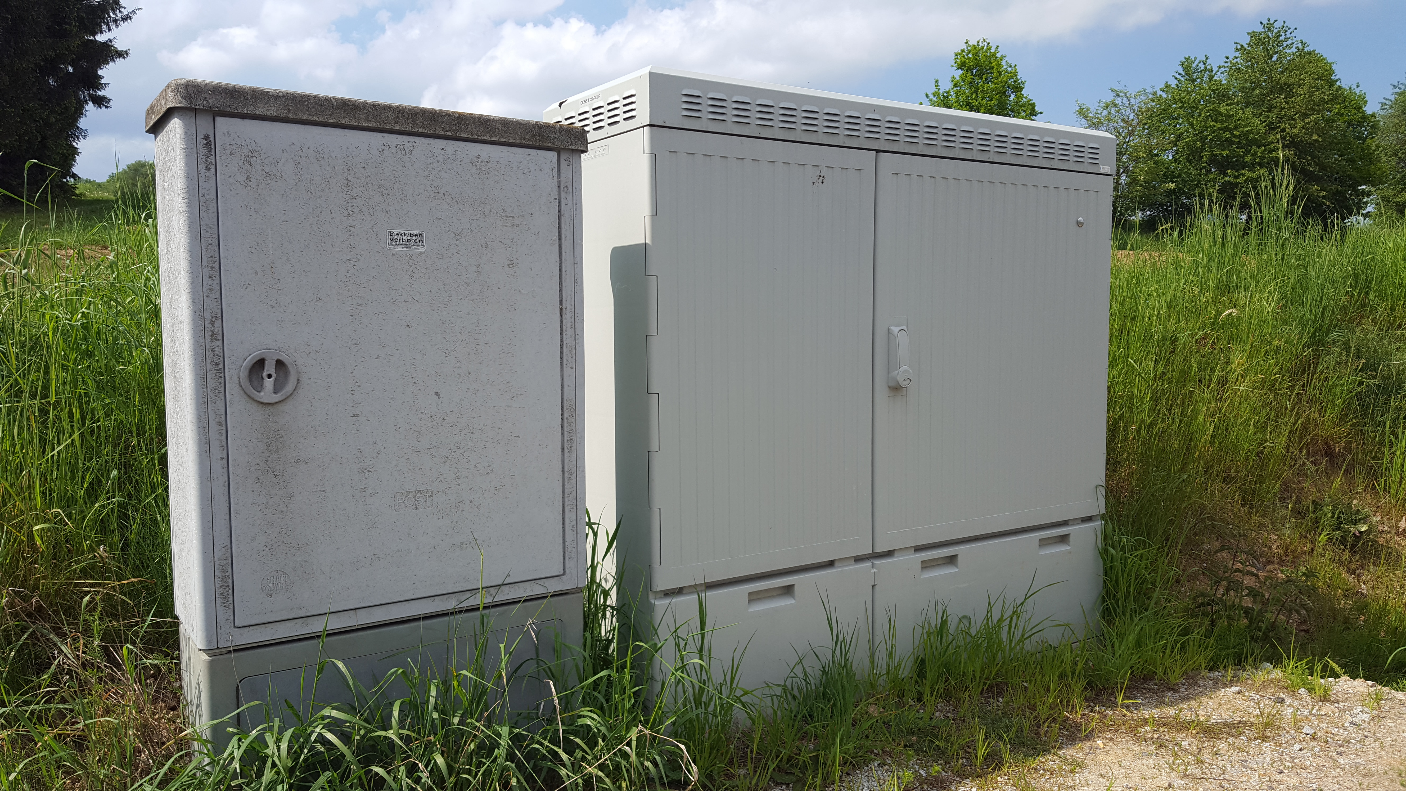 Alter Verteiler der Telekom neben neuen Kabelverzweiger (KVZ) der Firma Amplus.