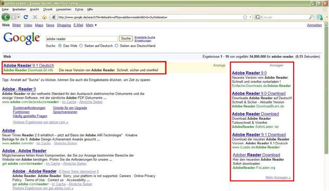 Ein Beispiel: Wir suchen bei Google nach dem kostenlosen Programm „adobe reader“.